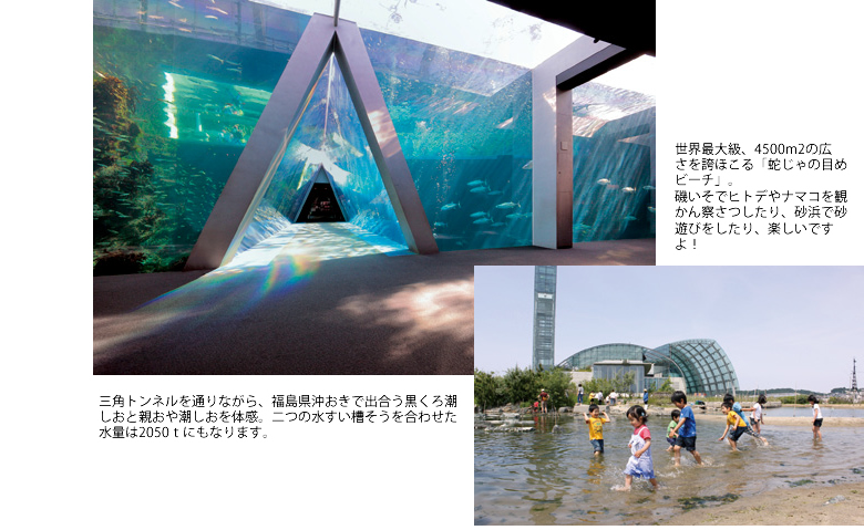 があり、子どもたちに大人気です。磯・干潟・砂浜の3つの環境が再現されたビーチに裸足で入り、ヒトデやナマコなど