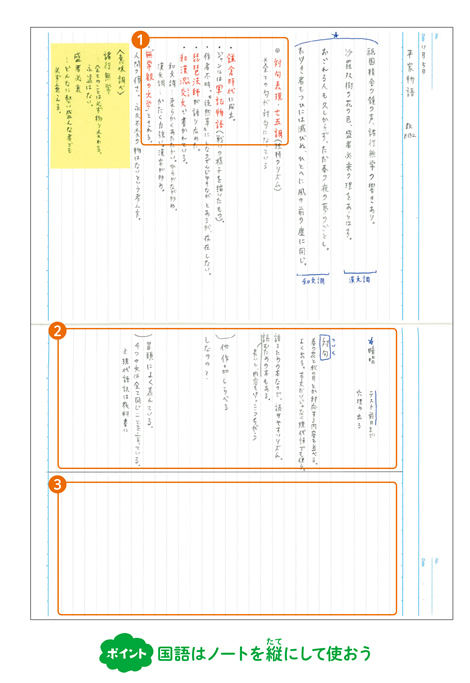 要点エリアは、授業中に使います。先生の話をよく聞いて、「ここは重要」「テストに出るよ」などと教えられたポイントを書き込みましょう。