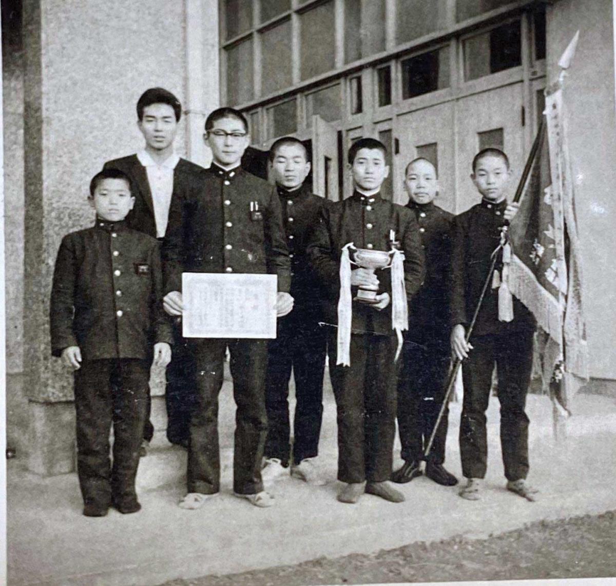 (上)中学時代、器械体操で優勝した時の1枚。表彰状を持っているのが北野学長。