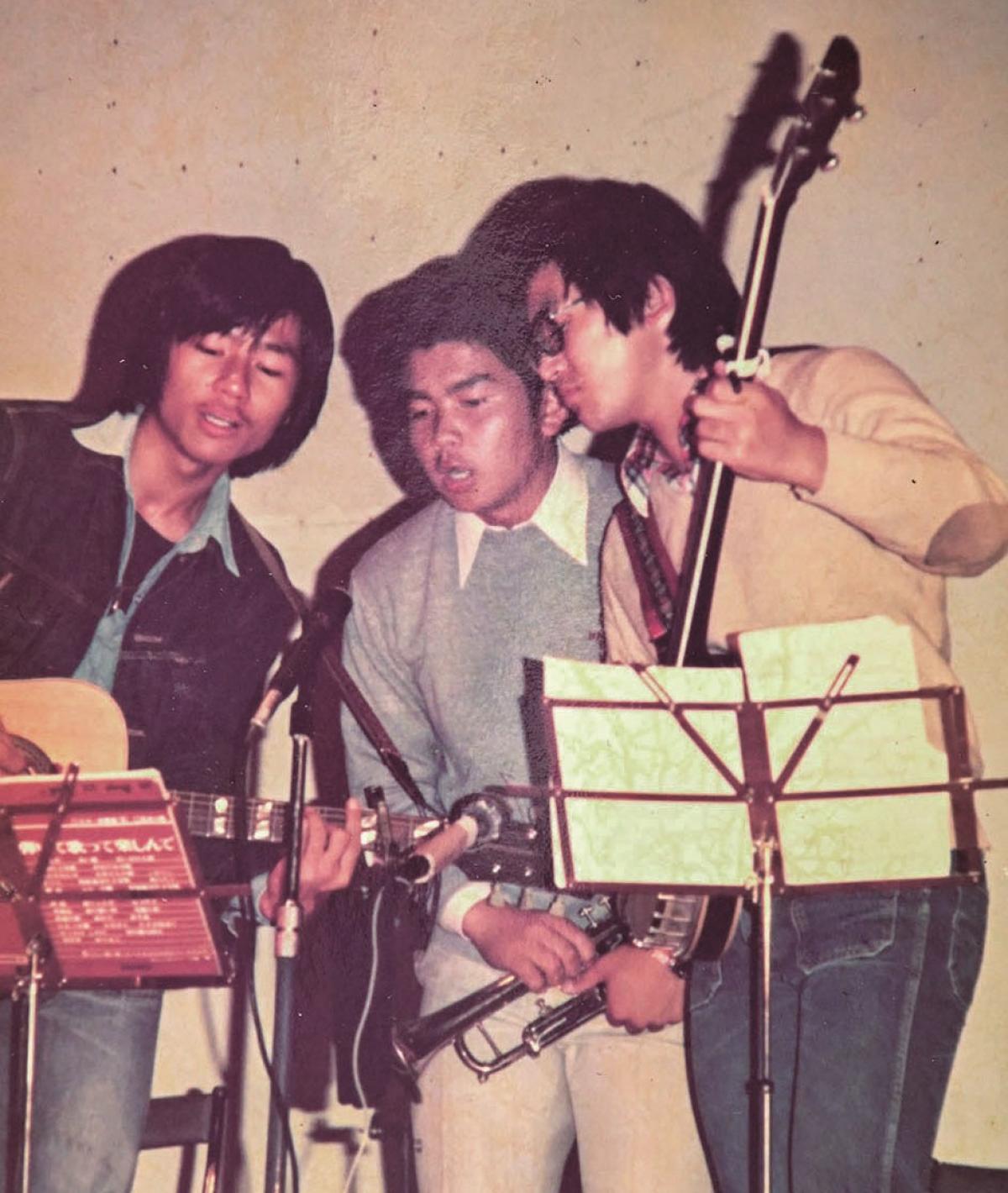 ▲高校時代の松本学長(左)、アルバイトで貯めたお金でギターを買い、友人と文化祭のステージに上がったり、知り合いの喫茶店でビートルズなどの曲を演奏したりしていました。