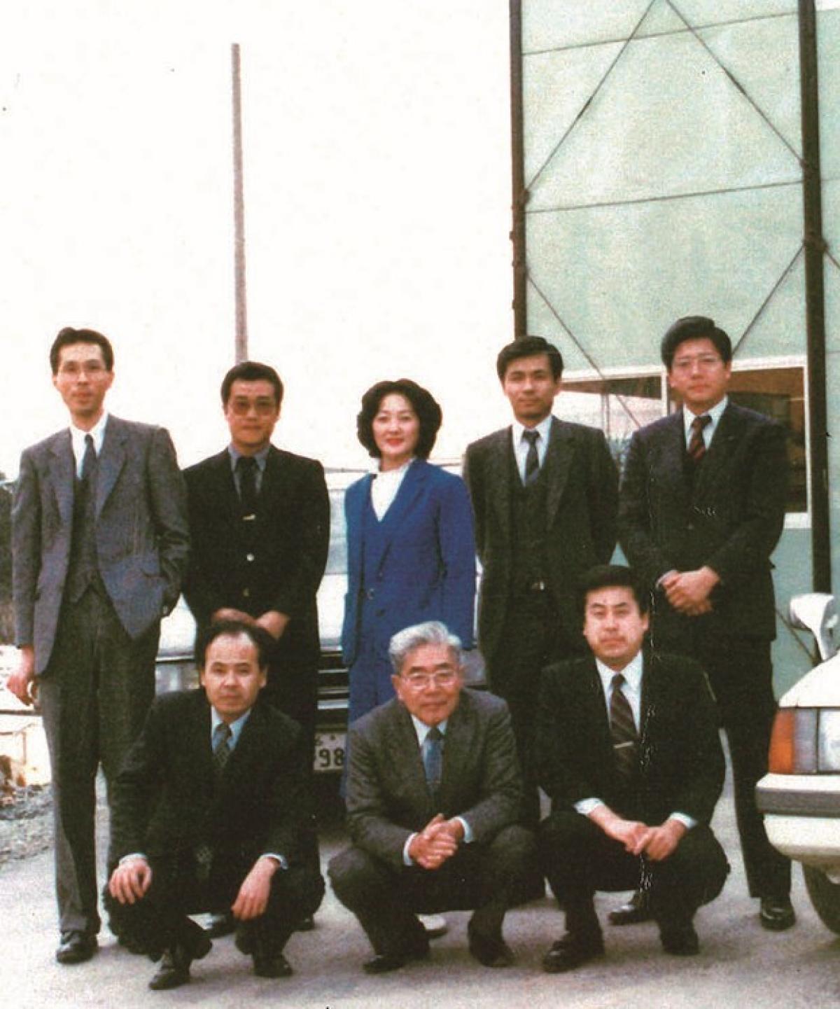 ▲「高校設置準備室」のメンバーと。後列右端が田野瀬良太郎総長(当時 県会議員)、その左隣が松本学長(当時 28歳)。