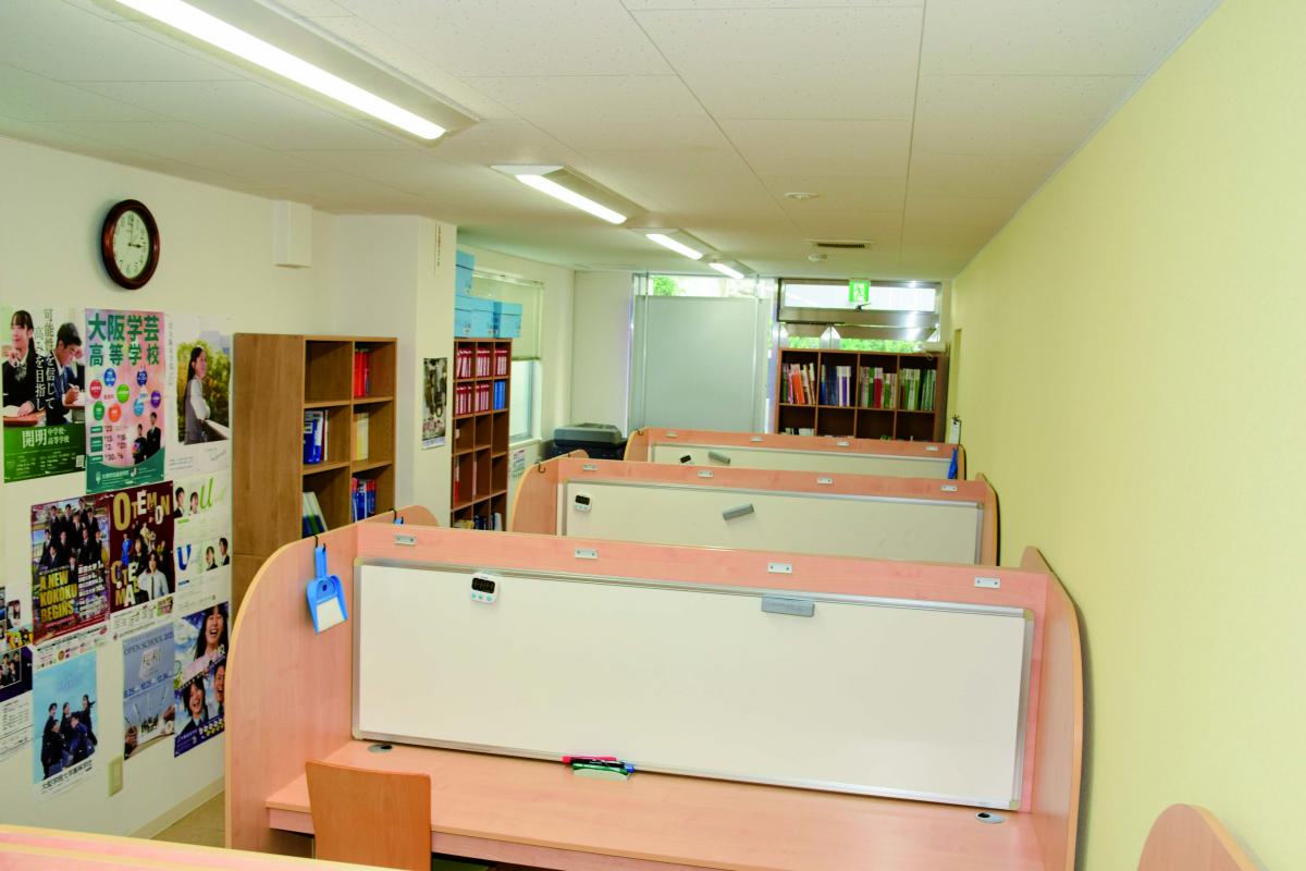 ▲教室内は明るく温かみのある雰囲気(上)。テキストや問題集は幅広く取り揃え、塾生のニーズに応えています(下)。