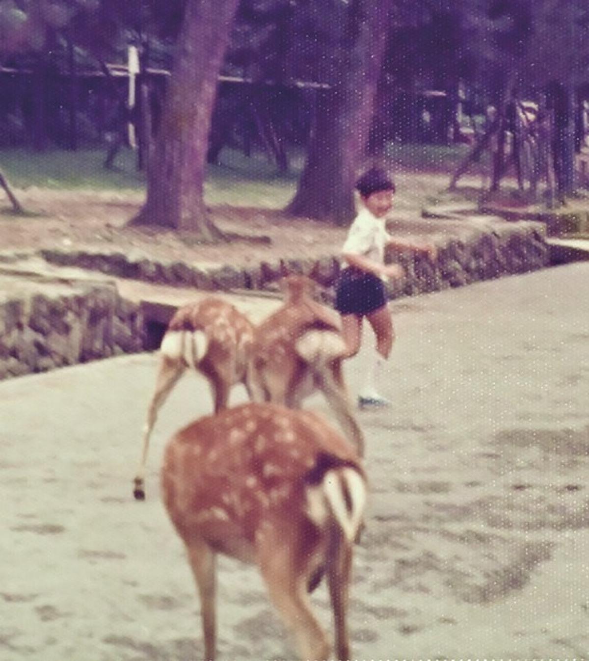 ▲浅草寺でお父様と(上)、奈良公園でシカに追いかけられて(下)……など、幼い頃の写真はお寺や古都で撮ったものが多いです。