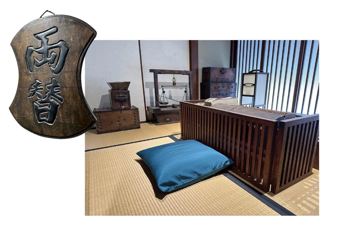 (写真左)江戸時代の両替商の木製看板。分銅をモチーフにしています。