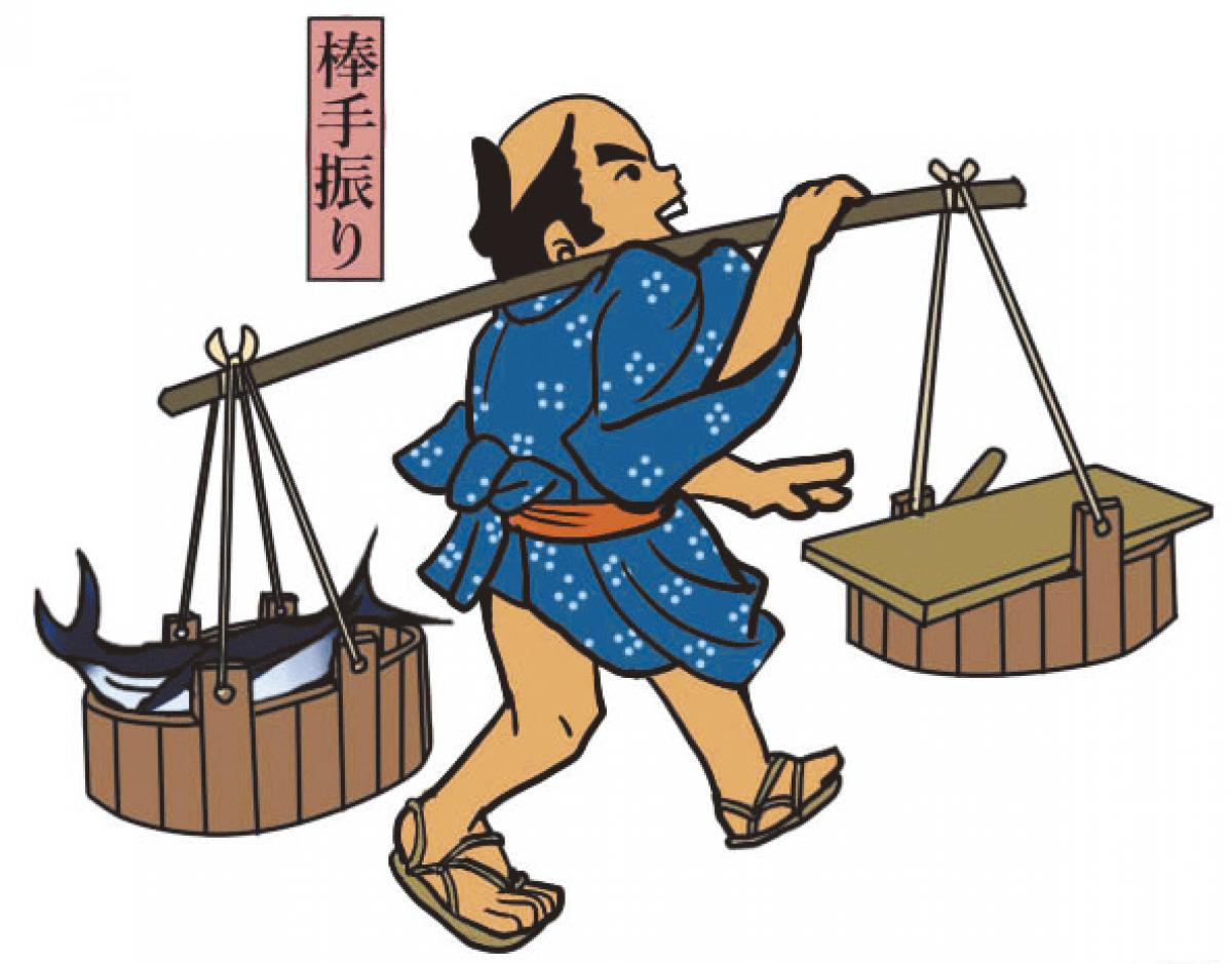 行商人は「振り売り」「棒手振り」とも言います。天秤棒を担いでいろいろなものを売り歩きました。