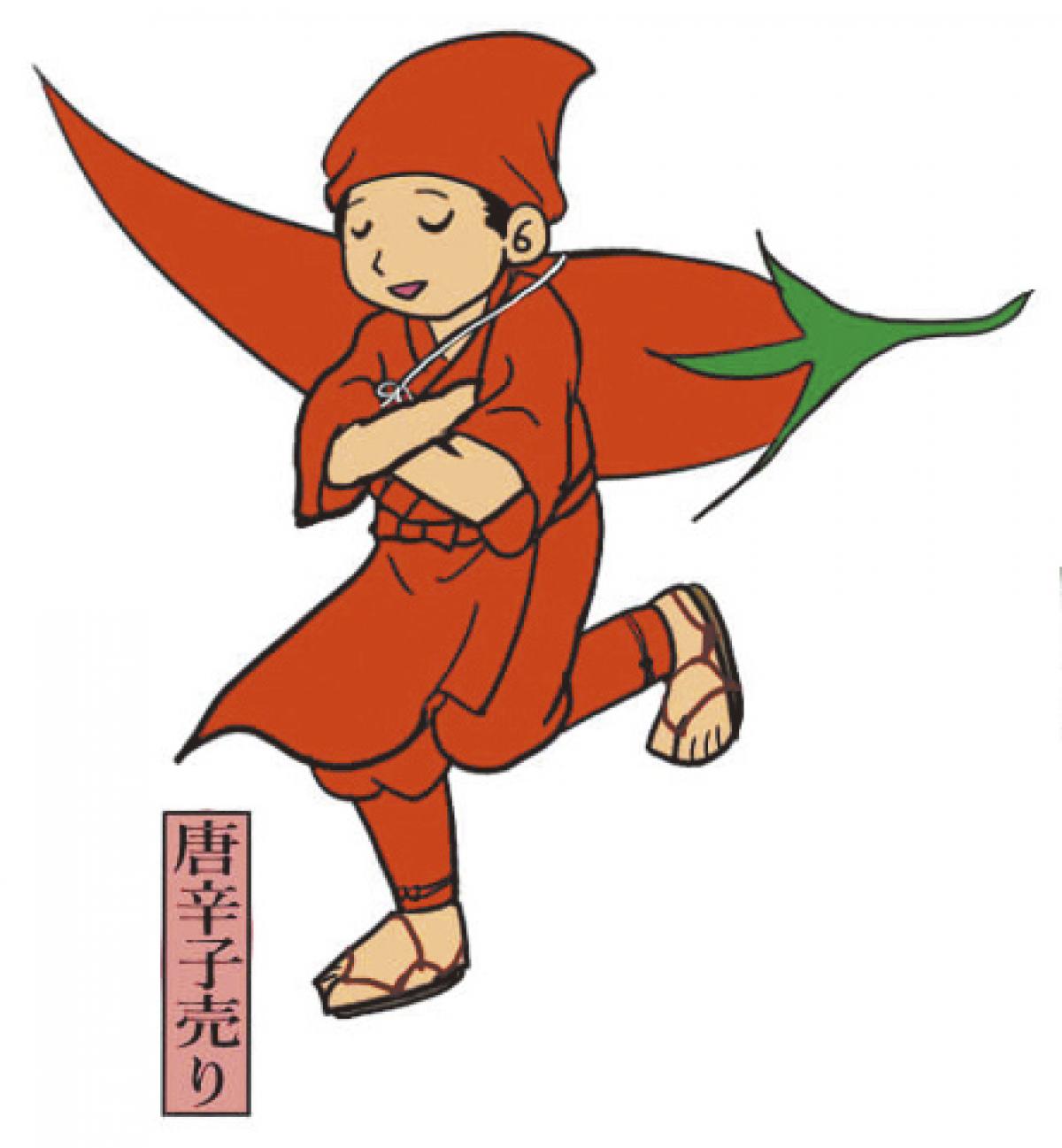 なかには、目立つ格好をして通行人の興味をひく人も。唐辛子の形をした大きな容器を背負い、その中に七色唐辛子の小袋を入れて売った「唐辛子売り」がそれ。仮装コスプレのような見た目は、さぞ注目を集めたことでしょう。